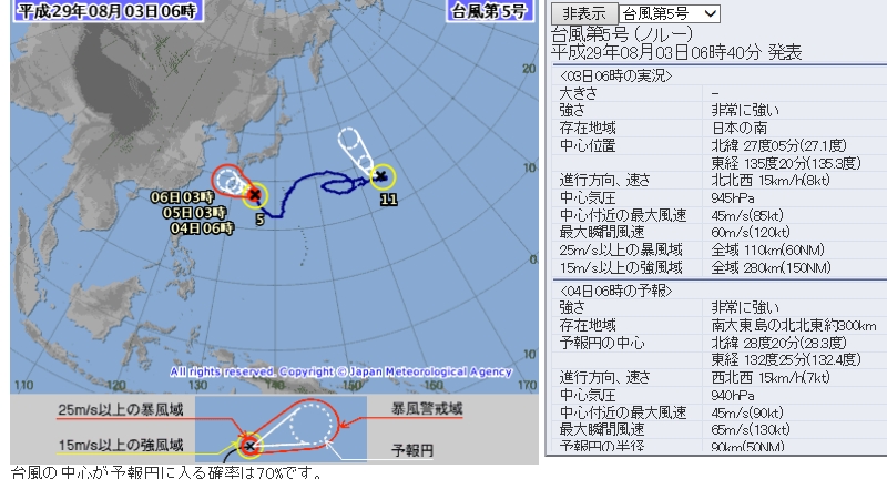태풍 노루는 초속 45m, 진행속도는 12km/h, 중심기압 945hpa, 강풍반경 280Km로 강도가 매우 강한 중형 태풍이다.