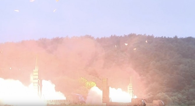 화성-12호가 발사된지 6분이 지난 15일 5전 7시3분 우리군은 현무 미사일을 사전 예정된 표적을 향해 발사했다.