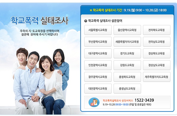 교육부는 18일부터 오는 10월27일 오후 6시까지 전국 초등·중·고교생을 대상으로 2017년 2차 학교폭력 실태조사가 시행한다.