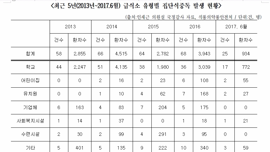 최근 5년간(2013년~2017.6월) 집단식중독은 281곳에서 발생했으며 1만5029명이 식중독에 감염됐다.