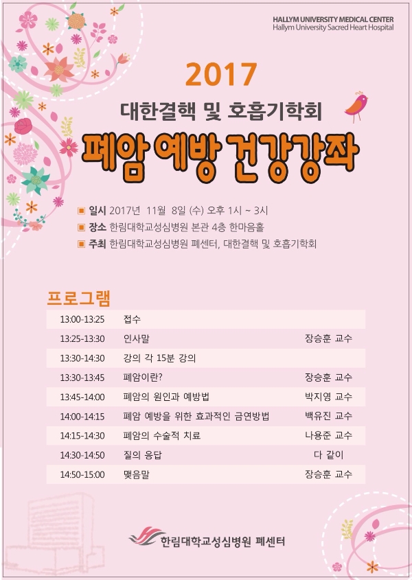 장승훈 센터장은 “폐암은 2016년 우리나라 암 사망 원인 중 1위를 차지할 만큼 치료가 어렵고 사망률도 높은 병”이라며 “이번 강좌는 폐암의 위험성, 예방, 치료에 관한 주제로 조기검진의 중요성을 알리고자 마련했다”고 말했다. 또 “많은 분이 참석해 폐암에 대한 궁금증을 함께 나누는 유익한 시간이 될 수 있을 것”이라고 참여를 독려했다.