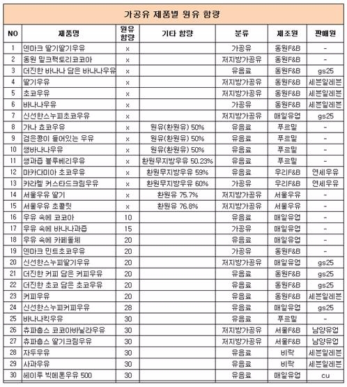 우유가 전혀 들어가지 않은 제품은 총 15개다. 매일유업에서 제조한 GS25 PB제품 '신선한 스누피 초코우유'와 동원F&B '더 진한 바나나 담은 바나나우유'·세븐일레븐 PB제품 '딸기우유'·'초코우유'·'바나나우유' 등이다. 전량 환원유로 제조됐다.