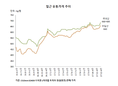 국내산 철근 유통시세는 기준가격을 넘어섰다. 제강사의 12월 건설사향 기준가격은 톤당 68만 5,000원이다. 따라서 유통 마감가격은 건설사보다 1만원 낮은 톤당 67만 5,000원 수준이다. 그러나 철근 부족감과 고철가격 상승으로 철근가격 인상 가능성이 높아졌다. 이에 유통시세는 무리 없이 기준가격을 넘어서고 있다.