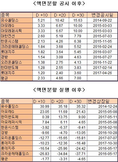 액면분할시 거래정지였던 대한전선을 제외한 10개 종목 중 실행 30일 이후 하락한 종목이 6개였다.