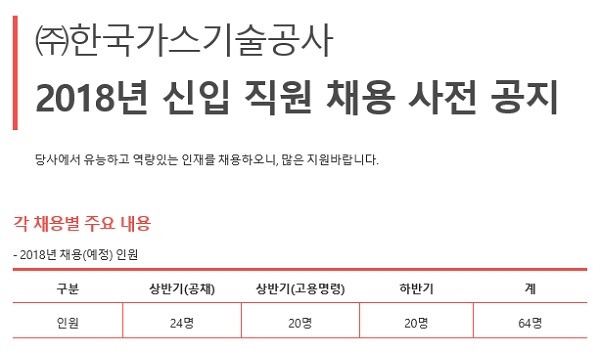 한국가스기술공사 2018년 신입 직원 채용 공고. 자료=한국가스기술공사.