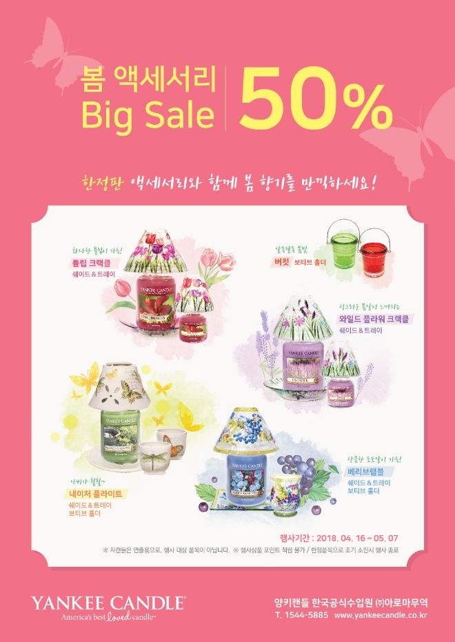 이미지 확대보기양키캔들 한국공식수입원 아로마무역은 봄 시즌에 어울리는 캔들용 액세서리를 50% 할인하는 행사를 진행한다.