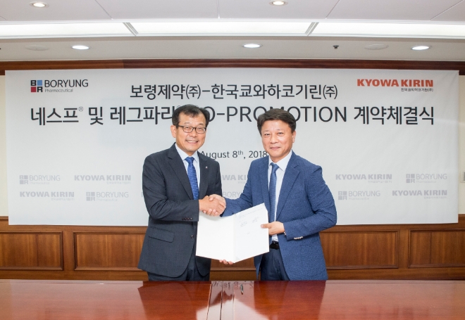 보령제약과 한국쿄와하코기린은 다음달 1일부터 만성신장병(CKD)환자에서 나타나는 빈혈에 대한 조혈제 ‘네스프’와 만성신장병환자 이차성 부갑상선 기능 항진증 치료제 ‘레그파라’의 코프로모션을 진행한다고 30일 밝혔다. 양사는 지난 8일 보령제약 본사에서 코프로모션 계약체결식을 진행한 바 있다. 이번 코프로모션 계약으로 보령제약은 신장 내과 의원, 신장내과 외 인공 신장실이 설치 운영되고 있는 요양병원을 중심으로 `네스프`와 `레그파라` 판매를 시작하고, 한국쿄와하코기린은 영업력을 종합병원에 집중하게 됨으로써 양사간의 협력을 통한 공동마케팅을 전개해 나가게 된다.