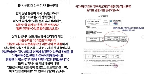 현재 언론에서 보도하는 당사 생리대에 대한 라돈수치는 '국가인증'이 아니라 단순히 저가의 라돈측정기인 '라돈아이'로 측정하여 당사측에 2시간 전 통보 후 그대로 기사화한 내용입니다.