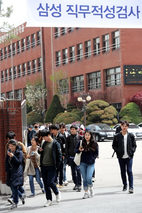 지난 4월 15일 오전 서울 대치동 단국대학교부속고등학교에서 열린 삼성 직무적성검사를 마친 수험생들이 고사장을 나서고 있다. 사진=뉴시스.