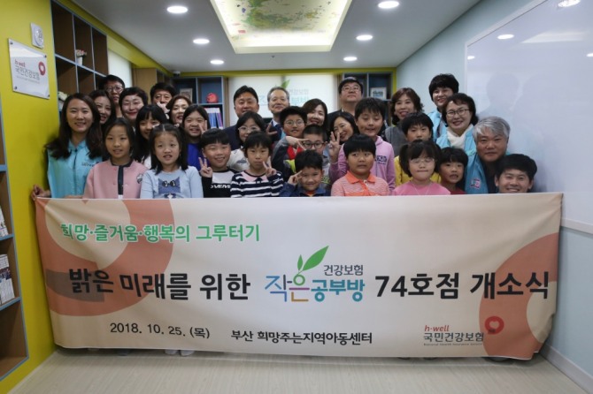 국민건강보험공단 부산지역본부는 25일 부산시 사하구 희망주는지역아동센터에서 ‘건강보험 작은공부방’ 74호점 개소식을 가졌다. 국민건강보험공단 부산지역본부=제공