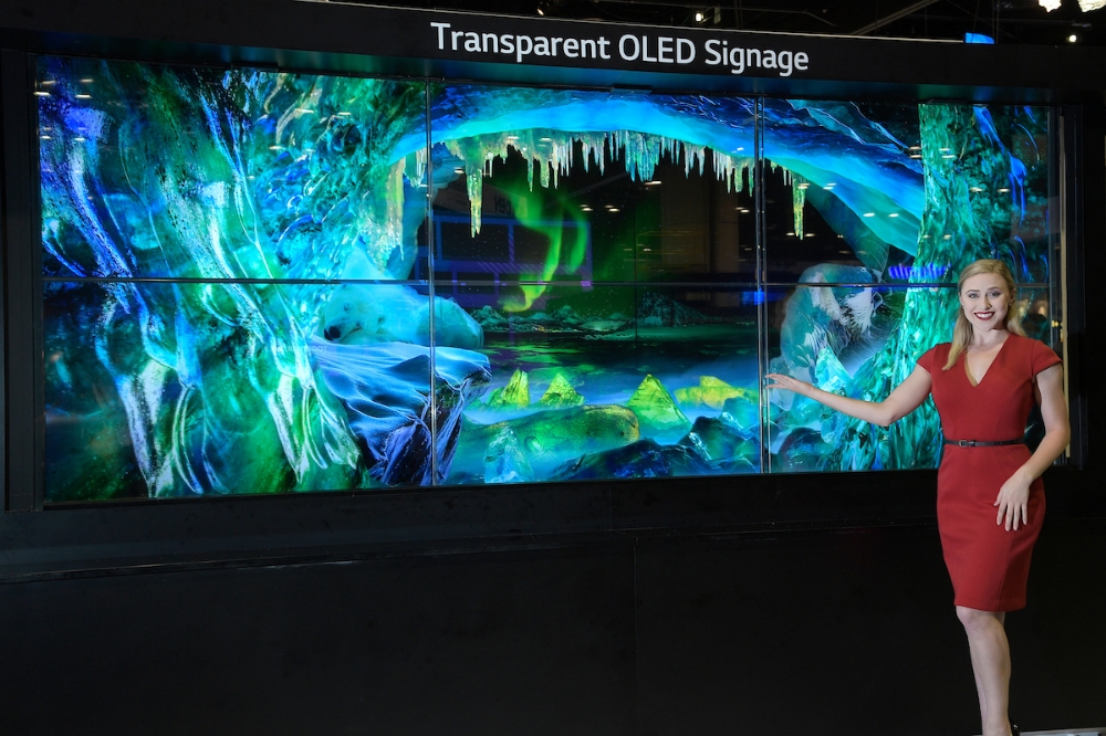 투명 올레드 사이니지는 선명한 화질과 투명한 디자인이 특징이다. 베젤이 두드러져 보이지 않아 여러 장을 이어 붙여도 이질감 없이 하나의 큰 화면으로 만들 수 있고 매장 쇼윈도로도 활용할 수 있다.