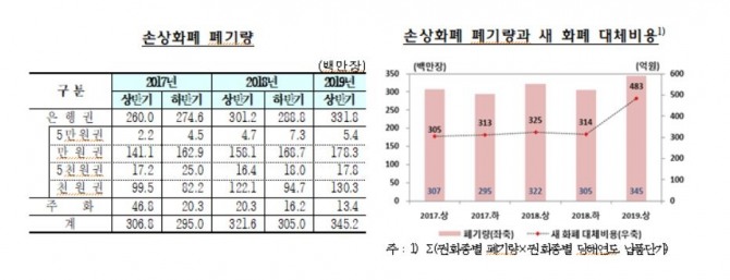 폐기한 손상화폐는 지폐(은행권) 2조2712억원, 동전(주화) 12억원이었으며, 이를 새 돈으로 바꾸는데 들어간 비용만 483억원으로 집계됐다.