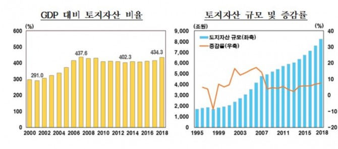 이미지 확대보기우리나라 GDP 대비 토지자산 비율은 2018년 434.3%로 2017년보다 18.2% 포인트 상승했다. 토지자산이 GDP 에서 차지하는 비율은 2015년 407.1%에서 2016년 410.5%, 2017년 416.1%로 확대됐다. 2018년중 GDP가 3.1% 늘어난 반면 토지자산은 7.6% 증가한 데 따른 것이다.