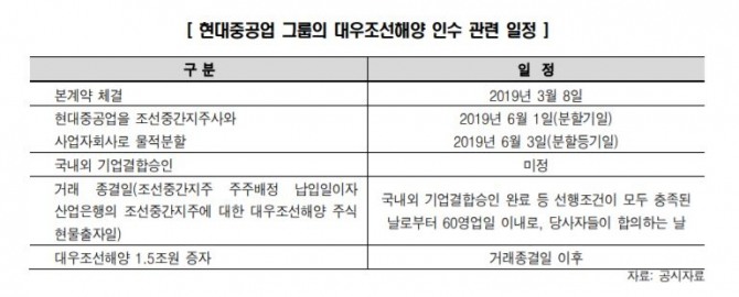 안 연구원은 "국내 공정거래위원회뿐 아니라 해외의 관련 절차는 장기간의 시일이 소요될 뿐 아니라, 그 완결과 관련한 불확실성이 내재되어 있다"며" 대우조선해양에 대해 이뤄질 예정인 1.5조원규모의 유상증자(제3자 배정방식으로, 전액 조선중간지주사가 참여할예정) 역시 본계약의 완결을 그 선행조건으로 하고 있다"고 설명했다.