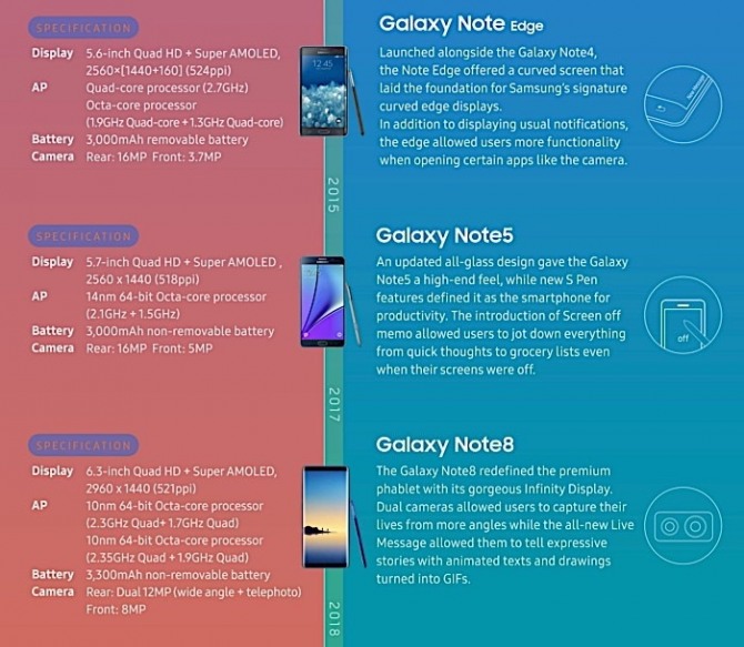 다만 갤럭시노트5와 갤럭시노트8 사이에 출시된 갤럭시노트7에 대한 설명은 포함되지 않았다.