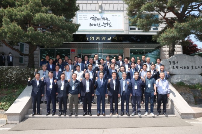 이성희 농협중앙회장(앞줄 왼쪽 여섯번째)이 12일 경기 고양시 소재 중앙교육원에서 진행중인 '조합장 ESG 아카데미'에서 참가자와 기념촬영을 하고 있다. [사진=농협]