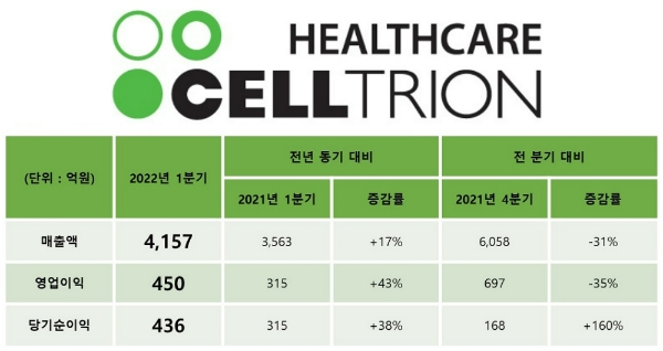 셀트리온헬스케어 2022년 1분기 실적요약 표. 사진=셀트리온헬스케어