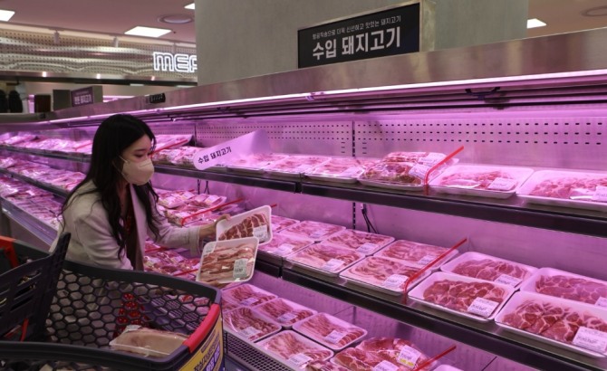 이미지 확대보기정부가 수입돈육에 과세를 부과하지 않는 '할당관세(0%)'를 적용하겠다고 밝히면서 주요 대형마트들이 수입산 돈육을 할인하는 행사로 장바구니 부담 덜기에 나섰다.