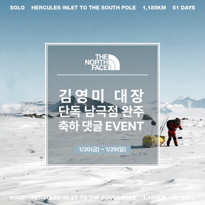 이에 노스페이스는 오는 29일까지 김영미 대장의 쾌거를 축하하는 이벤트를 진행한다. 노스페이스 공식 인스타그램에서 진행하는 이번 이벤트는 노스페이스 공식 SNS 계정을 팔로우 한 뒤 김영미 대장 관련 포스팅에 축하 메시지를 댓글로 달고 함께 축하하고 싶은 친구를 소환하면 참여 가능하다. 추첨을 통해 김영미 대장이 이번 남극점 탐험에서 입었던 것과 동일한 패딩 재킷과 비니를 각각 5명, 10명에게 경품으로 증정한다.