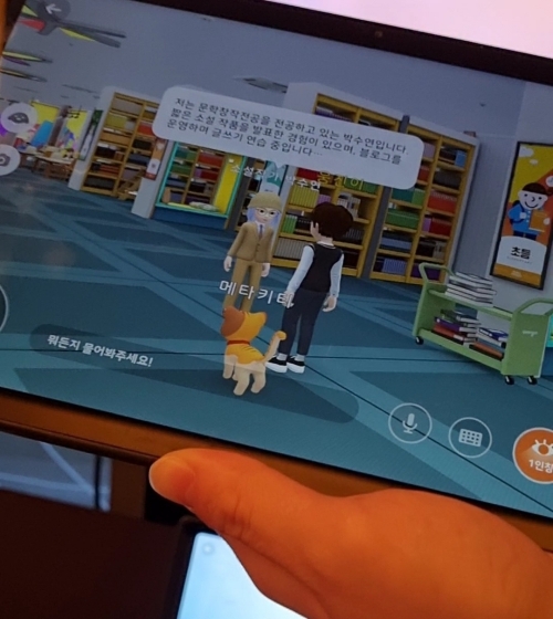 이미지 확대보기메타버스 공간에 구현된 도서관에서 한 NPC(Non-Player Character)에게 질문해봤다. ‘소설작가 지망생 박수연’은 고개를 갸웃거리며 잠시 고민하더니 곧 생생한 대답을 들려줬다.