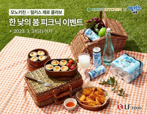 이미지 확대보기20일 식품업계에 따르면 LF푸드는 롯데칠성음료와 함께 '모노키친X밀키스 제로 한낮의 봄 픽(Pick)!크닉' 컬래버레이션 이벤트를 31일까지 전개한다. 봄 시즌을 맞아 피크닉, 캠핑 등 나들이 수요가 증가하는 시기인 만큼 고객이 맛있는 음식을 즐기며 여유로운 시간을 보내도록 기획했다.