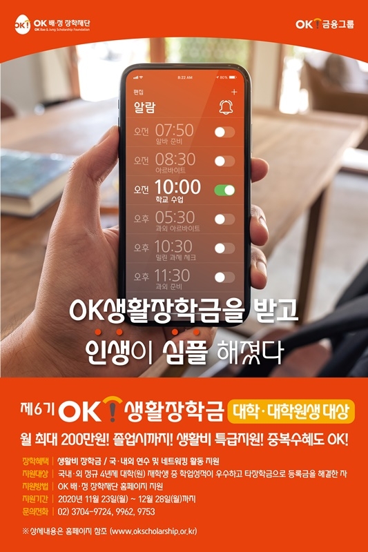 이번 OK생활장학생 모집은 등록금을 전액 장학금으로 해결한 대학생 및 대학원생을 대상으로 진행된다. OK배정장학재단은 서류 합격자를 대상으로 인·적성 검사 및 면접 전형을 거쳐 내년 2월 중에 최종 합격자를 선발한다는 계획이다.