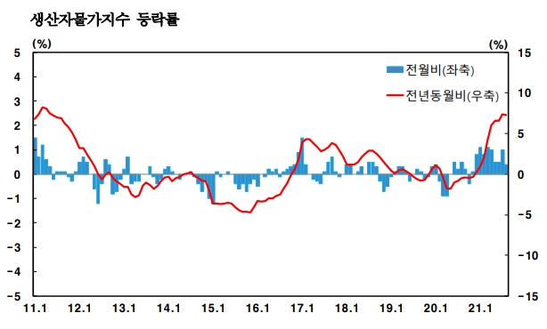 이미지 확대보기24일 한국은행이 발표한 ‘2021년 8월 생산자물가지수’에 따르면 8월 생산자물가지수는 110.72로 전월 대비 0.4% 상승했다. 이는 1965년 관련 통계 작성 이후 최고치로 생산자물가는 지난해 11월부터 10개월 연속 상승하고 있다.