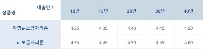 이에 HF공사 누리집을 통해 신청하는 'u-보금자리론' 금리는 연 4.35%(10년)에서 4.60%(40년), 전자약정 등 온라인으로 신청하는 '아낌e-보금자리론'은 이보다 0.1% 포인트 낮은 연 4.25%(10년)에서 4.50%(40년)가 적용된다.