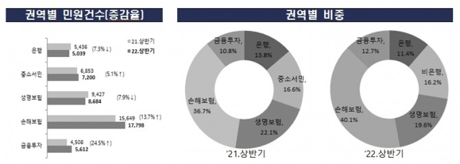 이미지 확대보기20일 보험업계에 따르면 2022년 상반기 금융 민원 접수 중 백내장 수술 관련 실손보험금 청구 민원이 늘면서 손해보험업권 민원이 크게 늘었다. 권역별 비중은 손보가 40.1%로 가장 많았고, 생보(19.6%), 중소서민(16.2%), 금융투자(12.7%), 은행(11.4%) 순이었다.