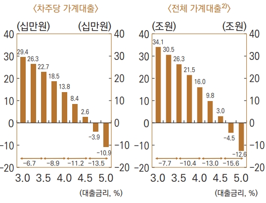 해당 보고서에 따르면 글로벌 금융위기 이후 대출금리가 1%p 상승할 경우 가계대출 변동 폭은 26조8000억원이 축소되는 반면, 하락 시에는 13조8000억원이 확대되는 데 그쳤다.