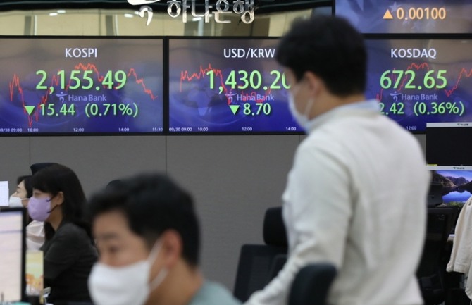 30일 오후 서울 중구 하나은행 딜링룸 전광판에 지수가 표시되고 있다. [사진=뉴시스]이미지 확대보기
