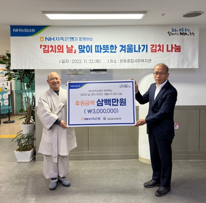 NH저축은행은 지난 22일 서울시 동작구 소재 본동종합사회복지관에서 「따뜻한 겨울나기 김장김치 나눔」 행사를 했다. 이날 이종욱 NH저축은행 경영지원본부장(오른쪽)과 본동종합사회복지관 관장인 종호 스님(왼쪽)이 기념사진을 찍고 있다. 사진=NH저축은행이미지 확대보기