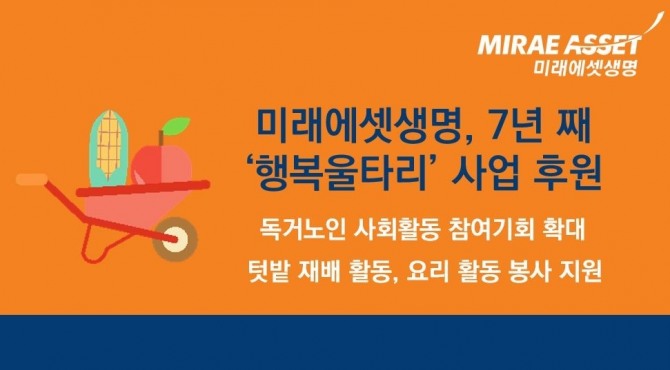 미래에셋생명은 올해도 행복울타리 프로그램 후원을 통해 사회적 관계망이 취약한 독거노인들에게 텃밭활동, 요리활동, 자조모임, 나눔활동, 나들이활동 등을 지원할 예정이다.