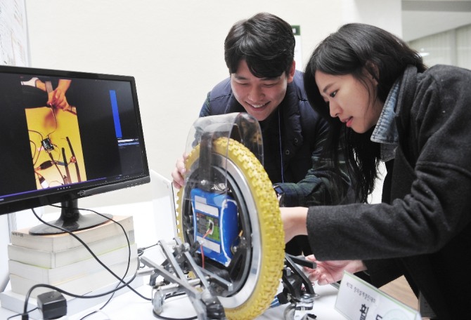 이미지 확대보기링크플러스사업단과 창업자람허브에서는 다양한 창업지원 사업은 물론 창업동아리, 박람회, 창업캠프, 창업경진대회, 공모전 등 창업에 필요한 역량을 키우는 핵심 프로그램을 총망라하고 있다. 여기에 소속된 창업 동아리만 50개에 달한다. 그중 대표적인 곳이 '수목(S.U.M.O.K, Start-Up Mainstream of Konkuk)'이다. 건국대 중앙발명동아리에서 시작된 이 동아리는 발명 제품을 토대로 창업을 희망하는 사람들이 모여 만들었다. 10명의 학생이 속한 수목은 이 학교 산업공학과 3학년에 재학 중인 송명진 학생의 아이디어에서 시작됐다.