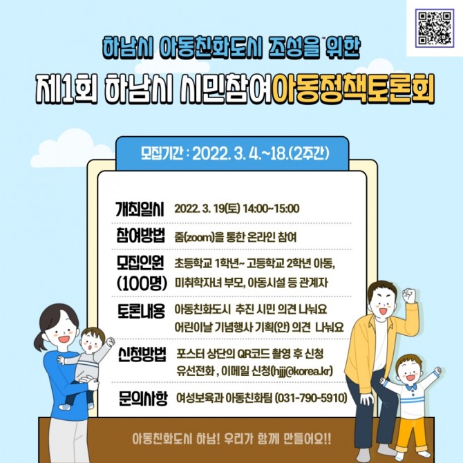 코로나19 확산에 따라 온라인으로 진행하는 이번 토론회는 초등학교 1학년 이상 아동, 학부모, 교육기관 및 아동시설 관계자 등 100명을 선착순으로 모집한다. 신청은 포스터 상단의 QR코드나 하남시청 공지사항을 통해 신청하면 된다.