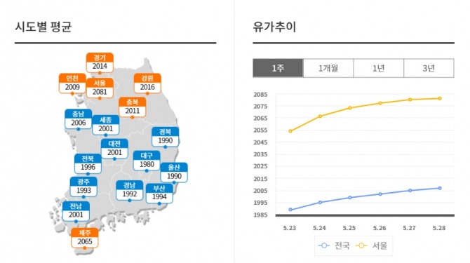 최저가 지역인 대구 휘발유 가격은 전주 대비 29.4원 상승한 리터당 1966.4원이다. 전국 평균 가격 대비 27.3원 낮은 수준이다.