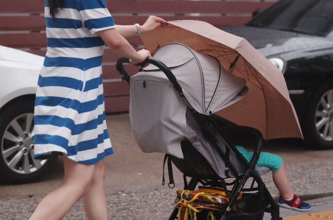 장마가 계속되는 29일 오후 서울 충정로을 지나던 한 시민이 비가 내리자 우산을 아이에게 씌워주고 있다. 사진=연합뉴스이미지 확대보기