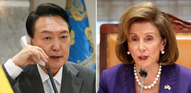 대통령실에 따르면 윤 대통령은 이날 오후 2시30분부터 40분간 서초동 자택에서 펠로시 하원의장과 통화했다. 인도태평양경제프레임워크(IPEF), 우크라이나 사태에 대한 협력, 글로벌 경제위기 속 공급망 대응 등 여러 경제안보 현안이 논의됐다.
