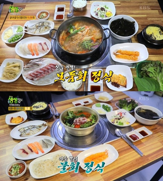 싱싱한 활어로 만든 숭어회와 도다리, 전어를 담은 모듬회와 초밥, 전어구이, 새우 튀김, 매운탕, 공기밥 등이 곁들인 모둠회 정식을 점심 특선(오전 11시~오후 3시까지)으로 1만원에 즐길 수 있다. 또 다른 인기 메뉴인 물회 정식도 1만원에 제공한다. 쌈채소와 밑반찬은 셀프바를 이용할 수 있다.