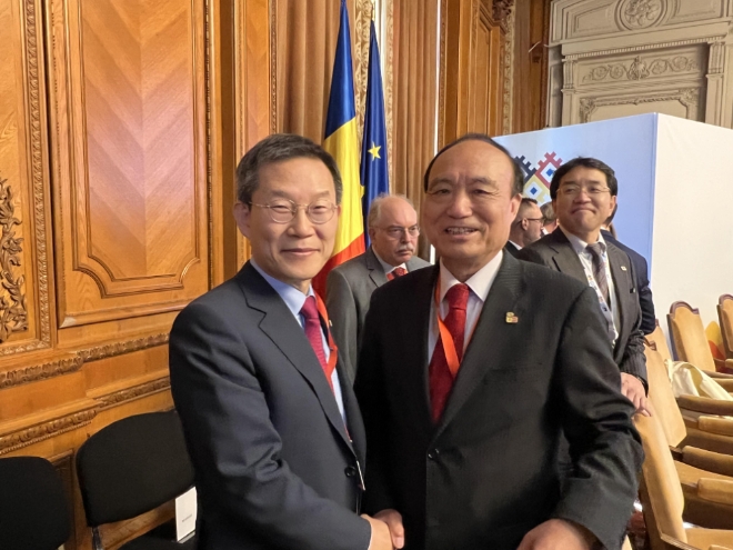 이종호 과학기술정보통신부 장관(왼쪽)이 지난 9월25일 루마니아 부쿠레슈티에서 개막한 국제전기통신연합(ITU) 전권회의에서 홀린 짜오(Houlin Zhao) ITU 사무총장과 함께 사진을 찍고 있다. 사진=연합뉴스