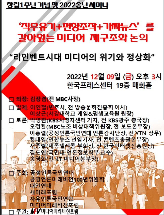 세미나에 좌장으로 김장겸 전 MBC사장이, 발제는 이인철 변호사 (전 방송문화진흥회 이사), 이상근 서강대학교 게임&평생교육원 원장, 토론에는 박영환 KBS시청자센터 기자 (전 KBS광주 총국장), 오정환 MBC노조 비상대책위원장 (전 보도본부장), 이홍렬 공정언론국민연대 언론감시단장(전 YTN 상무), 황대일 연합 뉴스 선임기자( 전 콘텐츠총괄본부장), 서종렬 세종텔레콤 부회장(전 한국인터넷진흥원장), 김도연국민대 언론정보학부 교수, 송영희 전 KT 미디어본부장이 참석한다.