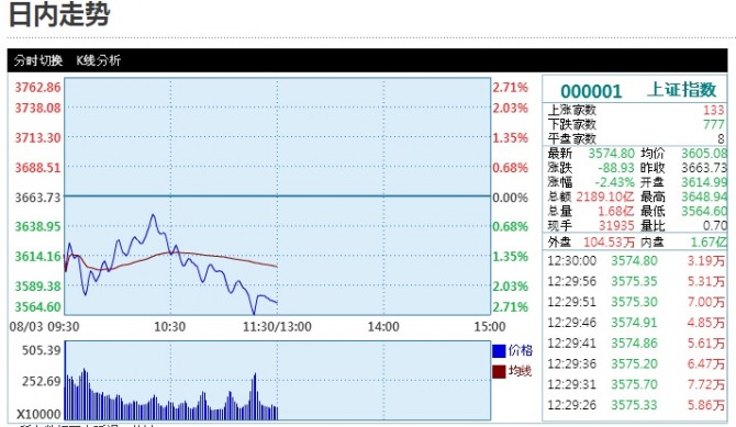 3일 상하이증권교역소에서 상하이종합지수는 3614로 개장된 후 계속 떨어졌다.