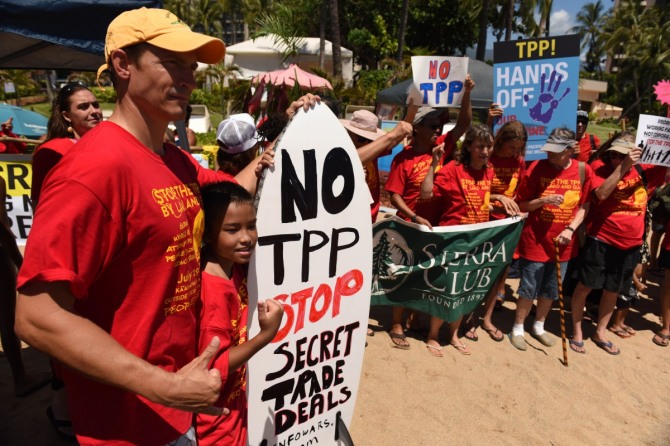 지난 7월 29일(현지시간) 환태평양경제동반자협정(TPP) 협상이 진행되는 하와이 마우이 섬에서 TPP에 반대하는 사람들이 시위하고 있다. 수백 명의 지역 주민과 국제적 시민단체의 대표들이 시위에 참석했다. /사진 = 뉴시스