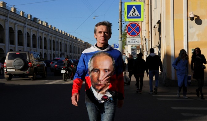 러시아에서 푸틴을 반대하는 여론이 확산되고 있다. 러시아 상트페테르부르크에서 블라디미르 푸틴 러시아 대통령의 모습이 그려진 셔츠를 입은 남성이 길을 건너고 있다. 사진=로이터