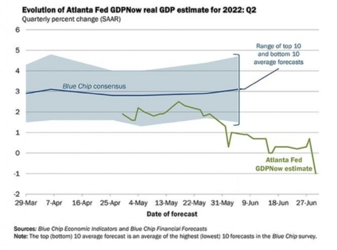1일 뉴욕증시에 따르면 미국 애틀랜타 연방준비은행(연은)이 추적하는 국내총생산(GDP) 전망치가 2분기 마이너스 대로 떨어졌다. 이같은 사실은 애틀랜타 연은 홈페이지에 공개됐다. 애틀랜타 연은의 GDP 나우 모델로 추정한 미국의 2분기 실질 GDP 성장률(계절조정치) 전망치는 이날 기준 -1.0%로 나타났다.지난 1분기 GDP 성장률 확정치 -1.6%에 이어 두 개 분기 연속 GDP가 마이너스를 기록할 것으로 예상한 것이다. 6월 27까지만 해도 GDP는 0.3% 증가한 상태였다. 뉴욕증시에서는 분기 성장률이 2개 분기 연속 마이너스를 기록할 경우 기술적 '경기 침체'로 판단한다.