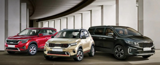 기아인도의 대표 차종들. 왼쪽부터 셀토스, 쏘넷, 카니발. 사진=기아인도