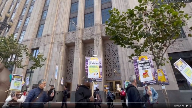 지난해 12월 6일(현지시간) 미국 샌프란시스코 트위터 본사 앞에서 트위터에 고용된 청소부들이 임금 인상을 요구하며 시위를 벌이고 있다. 사진=트위터이미지 확대보기