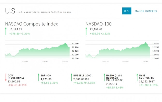 이미지 확대보기3일 뉴욕증시에 따르면 연방준비제도(Fed·연준) 금리인상 발표 이후 혼조세로 출발했으나 시간이 흐르면서 다시 폭발 장세를 보이고 있다. 나스닥지수가 특히 많이 올랐다. 다우지수는 뉴욕증시 폭발 와중에도 나 홀로 하락세를 보이고 있다.