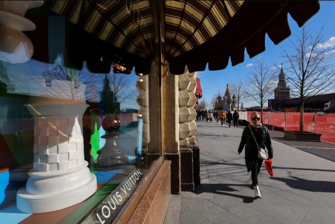 한 여성이 러시아가 우크라이나를 침공한 후 문을 닫은 모스크바 루이비통 매장을 지나가고 있다. 많은 미국과 유럽 국가들은 우크라이나 침공 이후 러시아에서 사업을 중단했다. 사진=로이터