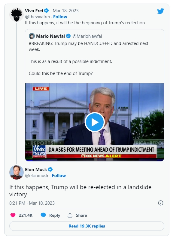 차기 대통령 선거에 출마하겠다는 뜻을 밝힌 도널드 트럼프 전 미국 대통령이 자신의 성추행 관련 의혹을 조사 중인 미국 검찰에 의해 금명간 체포될 가능성이 있다며 지지자들의 결집을 호소하고 나서면서 논란이 일고 있는 가운데 일론 머스크 테슬라 최고경영자(CEO)가 트럼프가 체포될 경우 벌어질 상황에 대한 예측을 내놨다.